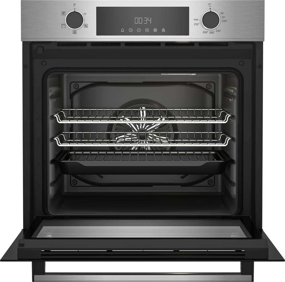 Integrate cooking style and efficiency to your kitchen units with the Beko CIFY81X single fan oven. You’ll find an impressive capacity, a great range of functions, and included accessories to help you start preparing meals straightaway.Five Function Fan OvenThis integrated CIFY81X from Beko comes with a 68 litre capacity and five shelf slots – providing plenty of space and flexibility to cook family meals. As an electric fan oven, it will heat up rapidly, having your dinner ready in less time and at lower temperatures than a conventional model. What’s more, the new air circulation system cooks your food even faster with more consistent results.You can select your programme and set the timer for your meal’s finish through the user-friendly touch screen LED display. This single oven comes with five functions, including:Fan HeatingElectric GrillDefrost FunctionGrill with FanWhy not make use of the integrated grill to brown your dishes or crisp them up. Plus, to help you get cooking in a flash, you’ll find the following accessories included in the box – two wire shelves, and a full size enamel cooking tray with an internal grill rack. You can also keep a close eye on the progress of your food with the oven’s interior light.Easy-Clean Oven DesignThis Beko fan oven has enamel side and back linings, as well as a removable glass door, making it simple for you to clean. To soften food leftovers even further via natural steam, then take advantage of the SteamShine cleaning function.Double-glazed, the door will keep the heat inside the cavity, and the exterior cool. The CIFY81X has been rated ‘A’ for energy efficiency too, helping you save money and the environment.You’ll find new design elements on this Beko single oven, including a revamped display, knob, handle and décor. As a built in model finished in stainless steel, it will be a stylish and streamlined addition to your kitchen.