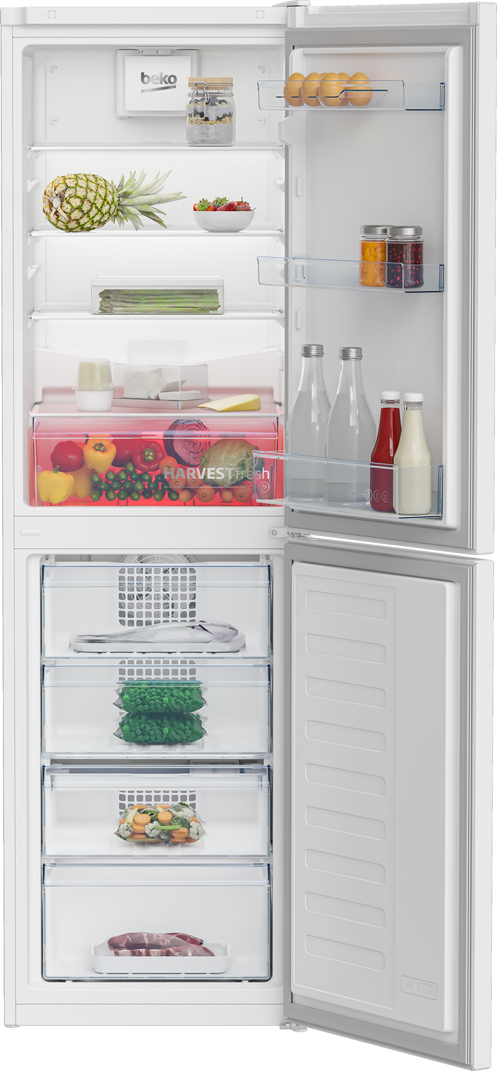 The CNG4582VW fridge freezer from Beko comes with a range of fantastic features to help you organise and store the weekly shop with ease. Featuring HarvestFresh technology, your food will stay fresher for longer. It uses three-colour light technology in the salad drawer to cleverly mimic the sun’s 24-hour light cycle. This preserves vitamins and minerals in your fresh produce resulting in less waste. Being a Frost Free model, you won’t have to spend hours defrosting your freezer. Freezer Guard technology also makes sure your freezer will function as intended in temperatures as low as -15°C.Key FeaturesHarvestFreshTotal Frost Free technologyFreezer GuardProduct Dimensions (H x W x D)182.4cm x 54cm x 57.5cm