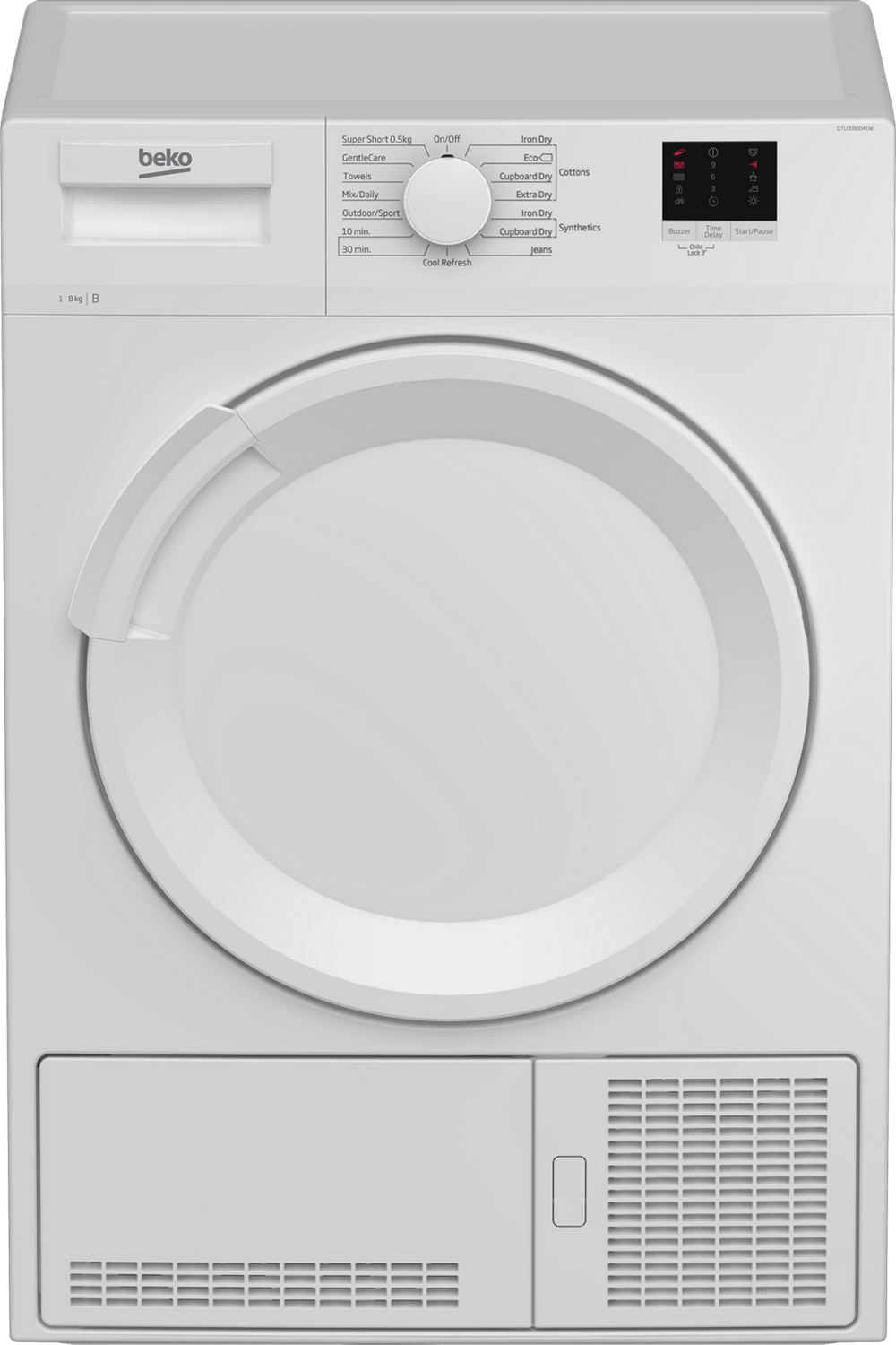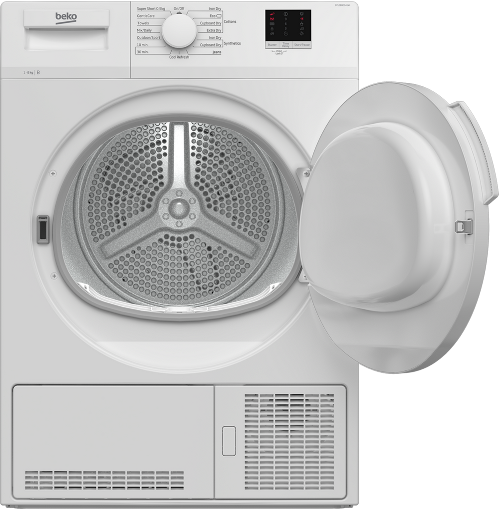 The Beko DTLCE80041condenser dryer's 8kg load capacity allows you to dry larger items with ease. It can also prevent the over-drying of clothes with sensor programmes, which stop the cycle when the optimal dryness level has been reached.Perfect ProgrammingThe Beko DTLCE80041W has a wide range of 15 programmes that will dry and protect your clothes, including:• Cottons• Synthetics• Synthetics Iron dry• Jeans• GentleCare• Cool Refresh• B energy rating• Automatic anti-creasing feature• Reverse action drum• Auto Cool down phase• Special programmes including Jeans, Sports, Refresh• Time delay function 3, 6 or 9 hours• Water Tank full indicator light• Filter cleaning indicator light• End of cycle buzzer• Large porthole doorOr, why not use the Cupboard Dry programme. With this option, you can put away perfectly dry clothes in your wardrobe, ready to wear for when you next need them. And, if you’re in a hurry, the Quick Dry programme will have your outfit ready in just 10 minutes.Also discover Beko’s Sensor Drying technology, which works in perfect harmony with your life. Sensor programmes allows you to decide beforehand exactly how dry you would like your laundry. Detecting moisture levels in the drum, cycles stop as soon as the desired dryness has been achieved. Not only does this feature protect your clothes from over-drying, but it also saves you money on energy bills.Plus, if you need an outfit ready for the morning, why not use the delay start feature. This can be scheduled up to nine hours in advance.Anti Crease TechnologyReduce your ironing pile with the reverse action drum on the DTLCE80041W, which helps to remove wrinkles in your garments by separating them as they dry.If you’re rushing out of the door, then the Automatic Anti Crease technology is perfect for when you can’t unload the laundry right away – this function rotates the drum periodically for up to two hours after a cycle has finished. You can easily monitor your clothes progress with the display’s indicator lights, and use the buttons and dials to select which programme you need.With a large 8 kg capacity drum, this Beko tumble dryer is perfect for a family home. The large 32 cm porthole door also makes loading the DTLCE80041W easier, especially for bulkier items like bed linen and duvets. As this tumble dryer is freestanding, you have the flexibility to position it anywhere that suits you – but if you need to put it on top of another appliance, then there is an optional stacking kit to help.Finished in a white design, the freestanding condenser tumble dryer has been styled to fit into any home perfectly. Buy the Beko DTLCE80041W today.