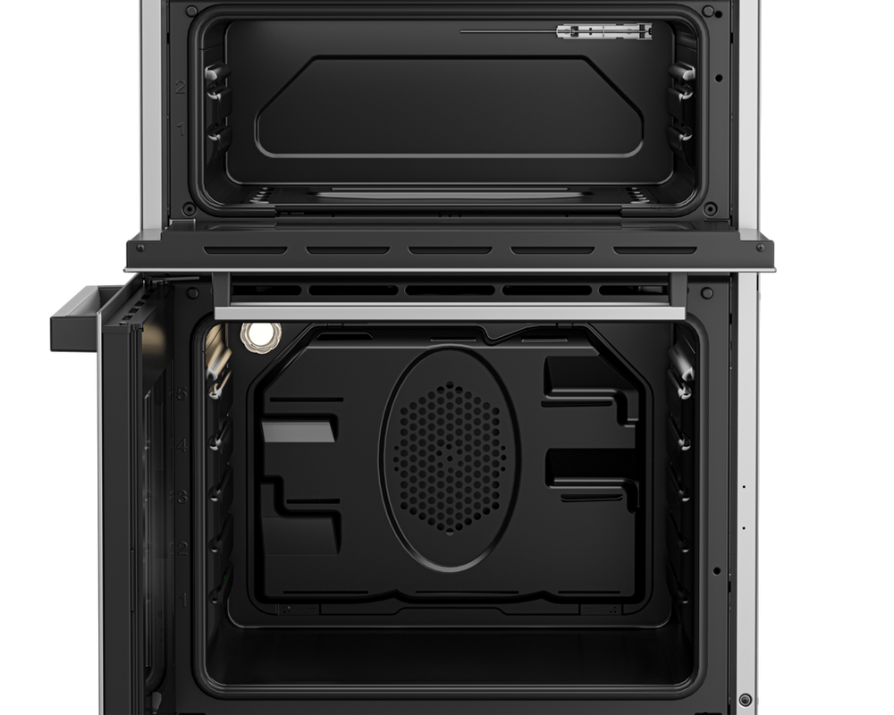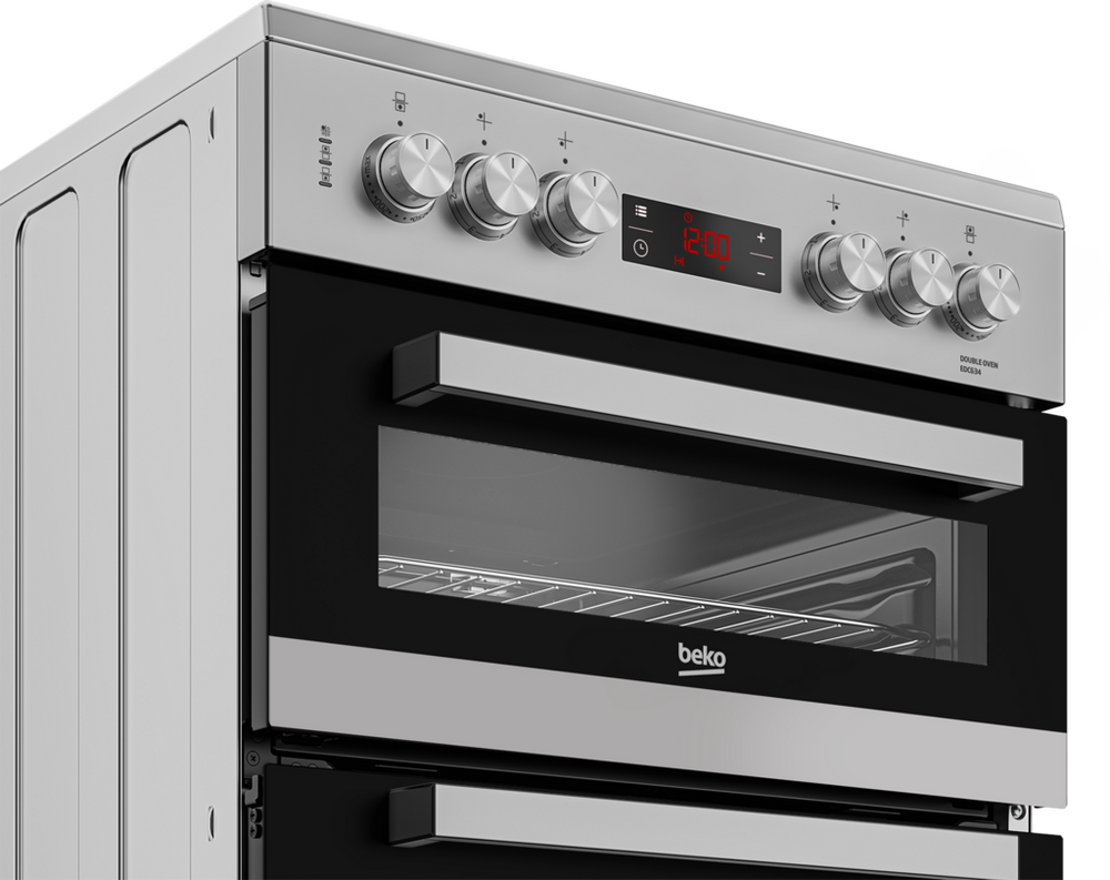 The Beko EDC634S is an attractive appliance with some great features. With a spacious double oven, ceramic hob and integrated grill, this cooker offers plenty of room for creating large family meals.As this model is exclusive to Euronics and Agent stores, you won’t be able to get it at any other retailer.Cooking FlexibilityHaving two ovens with a large, combined capacity of 105 litres gives you even more flexibility to cook various food types at once.A larger 69 L main oven uses fan cooking – this evenly distributes hot air throughout the oven, making it ideal for roasting. If you like batch baking, then you can easily spread food across the two shelves. Whether you’re cooking the goose on Christmas morning or baking some cupcakes with the kids, the EDC634S shelves can be adjusted according to your needs.The top oven has a 36 L capacity and an integral grill, so you can make the perfect cheese on toast in no time, just the way you like it.Beko’s electric ceramic hob has four Rapidlite zones, which deliver quick and efficient pan heating. The hot hob warning lights are ideal for the safety-conscious, as they remain lit until the hob surface is safe to touch.Beko DesignThe main oven on the EDC634S has an easy-clean enamel lining, so you can always keep your oven hygienic and free from burnt food residue. Use with the Steam Shine function which features steam to soften dirt and grime – then just wipe away with a soft cloth. The inner door glass can also be removed when you fancy giving your appliance a deep clean.Beko has also included an interior light in the main cavity, so you can check on your food through the glass door, without having to let any heat out during cooking. To make monitoring the progress of your cooking easier still, there’s a digital clock with a countdown timer. This means you can keep track of your cooking times without the guesswork.Controlling the EDC634S is easy thanks to the dial controls and the triple-glazed glass doors will help keep heat inside the appliance – making it energy efficient too.Product DimensionsDepth: 60 cmHeight: 90 cmWidth: 60 cm