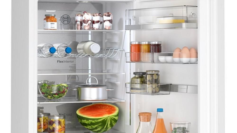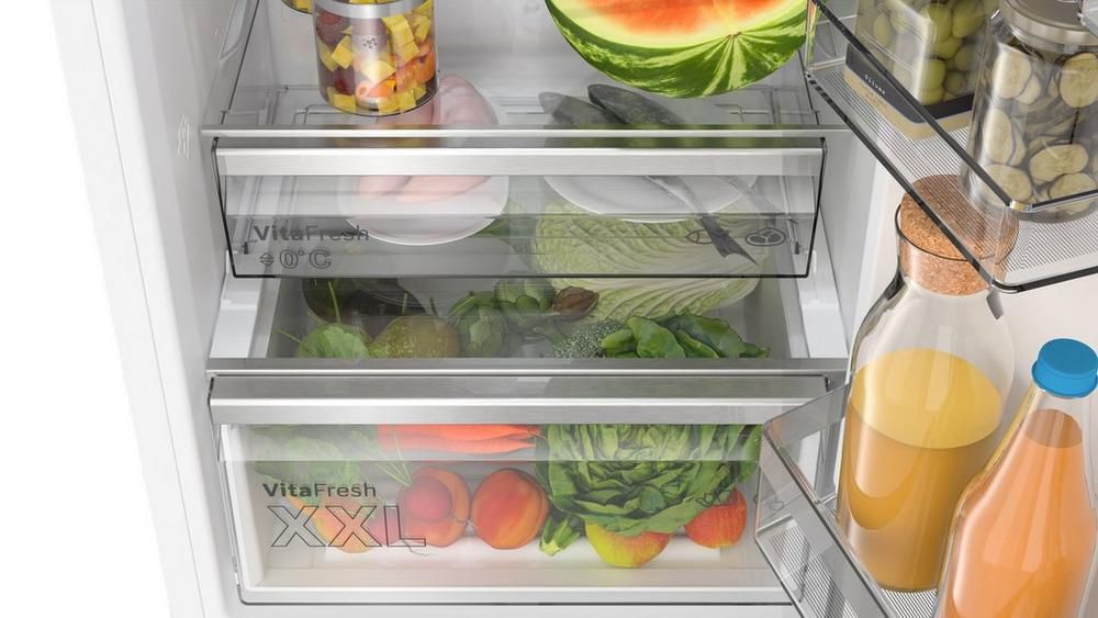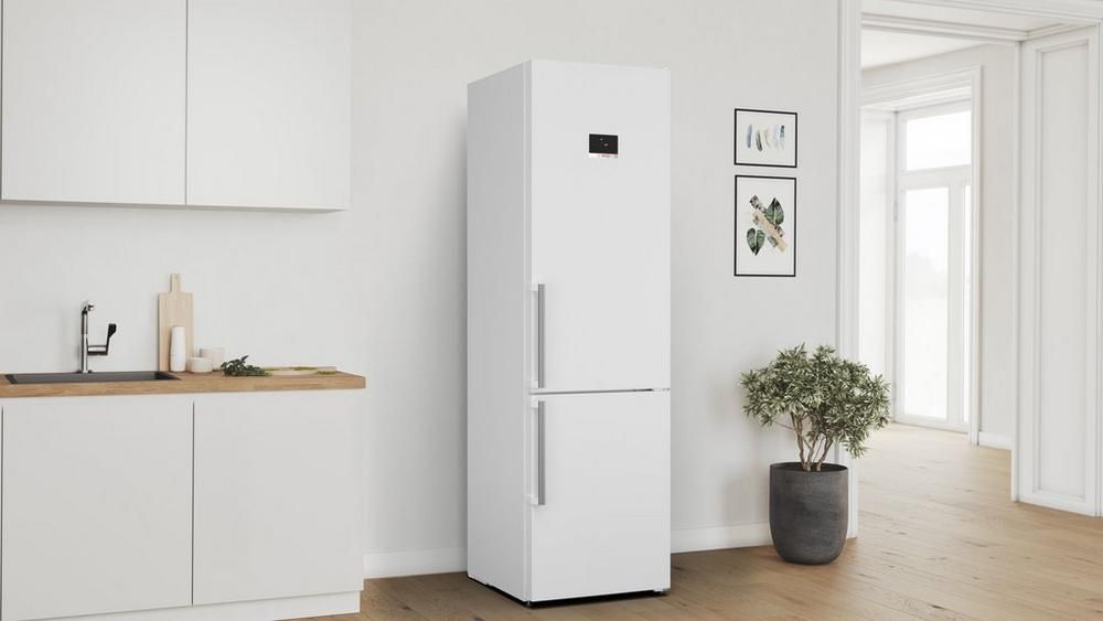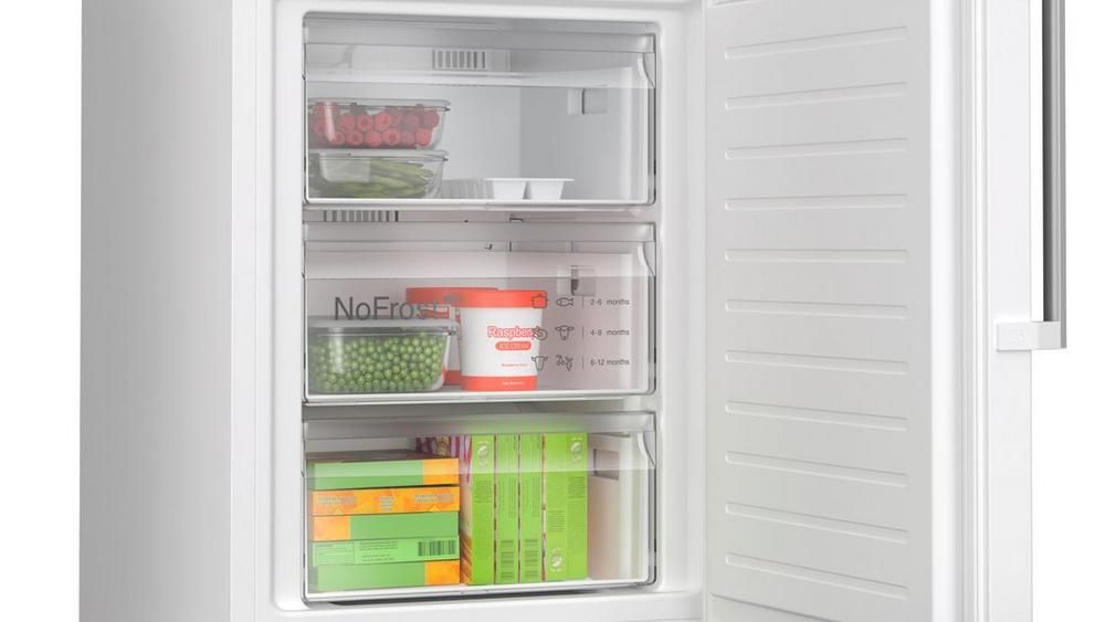 Forget the hassle of defrosting. NoFrost on this Bosch KGN39AWCTG fridge freezer maintains a steady flow of dry air throughout your fridge-freezer to prevent ice from building up. It’s the end of the ice age, and the hassle of defrosting is gone for good.Key featuresNoFrost: you’ll never have to defrost your fridge-freezer againFlex Interior: adjust the interior of the fridge to your needs thanks to Flex Trays and Flex ShelfMetal backwall with MultiAirflow: evenly circulates cool, fresh air to maintain consistent temperaturesVitaFresh XXL Pro 0°C: climate-controlled compartments lock in freshness and nutrients for longerPerfect Fit: place your fridge right next to walls and other appliances to save spaceBrand Name BoschMulti Air Flow Technology YesWeight (Approximate) 80 kgFast Freeze YesFreezing capacity per 24hrs (kg) 10 kgDisplay Screen Type External controlsManufacturer BSH Home Appliances LtdDoor Alarm Yes - both Fridge + FreezerHeight 203 cmDigital Inverter Compressor YesColour WhiteWidth 60 cmDepth 66.5 cmEnergy Efficiency Class CInstallation Type FreestandingDefrost Type Auto-DefrostNet Refrigerator Capacity - ltrs 260 LtrsNet Freezer Capacity - ltrs 103 LtrsNumber of Refrigerator Shelves 5Number of Refrigerator Crispers 1 VitaFresh XXLNumber of Refrigerator Door Bins 4Colour of Drawers TransparentReversible Doors YesLighting Type LEDStar Rating 4 StarProduct Type Fridge FreezerShipping Height 209.5 cmShipping Width 66 cmShipping Depth 78 cmAdditional Information Free-standing fridge-freezer with NoFrost freezer at bottom, 203 x 60 cm, White, Serie 6Fast Chill functionEnergy consumption annual - NEW (2010/30/EC) (kWh/annum) 162Environmental features: CFC free, HFC freeAdjustable Shelves YesFeatures No FrostFlex InteriorMetal backwall with Multi AirflowVita Fresh XXL ProPerfect FitCertifications + Standards CEVDENumber of Freezer Drawers 3Storage Power Failure (Hours) 15 Hours