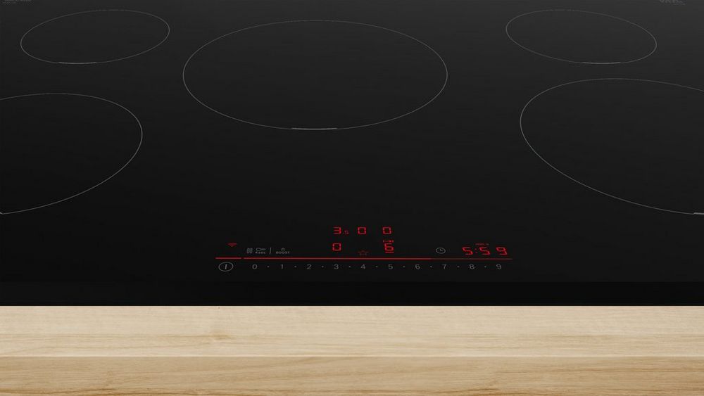 Cooking is easier than ever with this 80cm induction hob from Bosch. DirectSelect allows you to select the cooking zone, specific power level, and additional functions using the intuitive panel and supportive lightline. Use PowerBoost for up to 35% more power compared to the highest level when you need it – perfect for faster heating such as boiling. Plus, the PIV831HB1E is compatible with Home Connect – just download the app to your smartphone, connect your hob and you’re away.