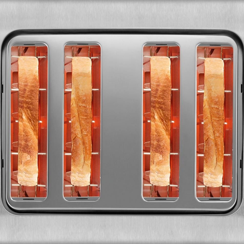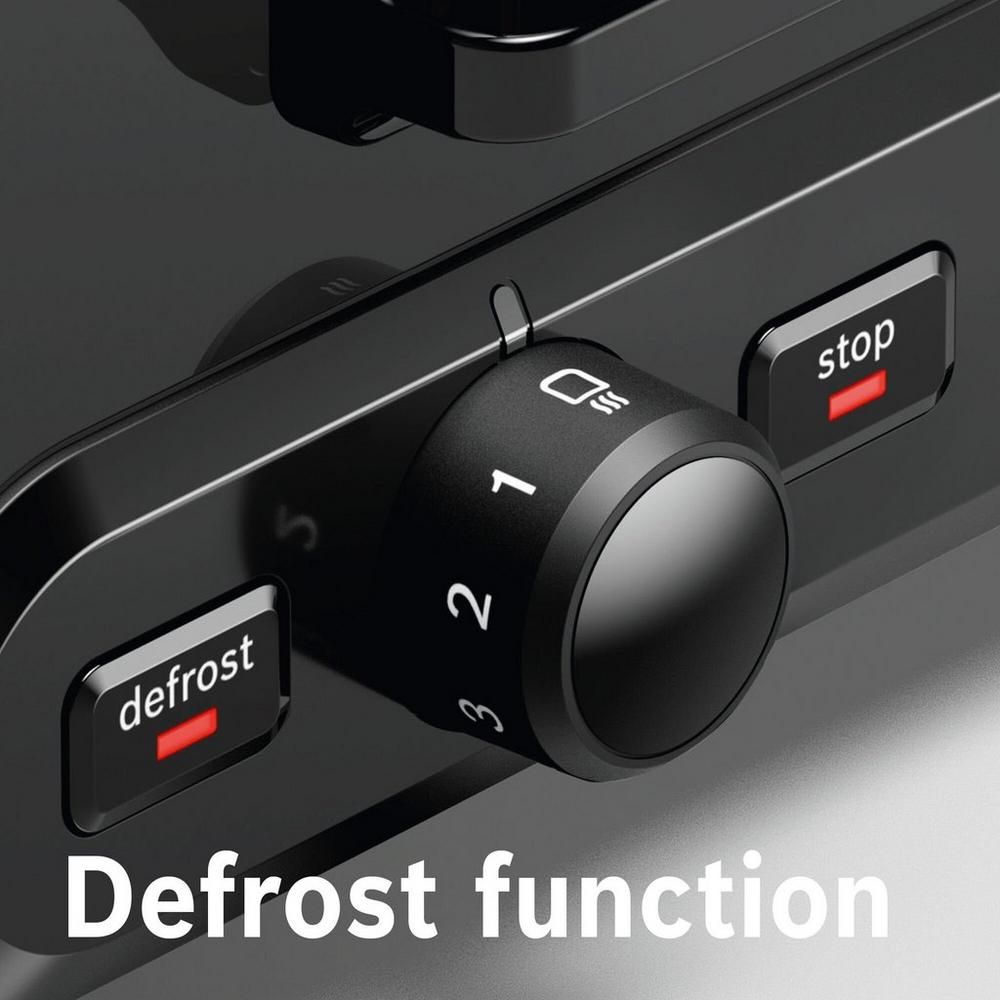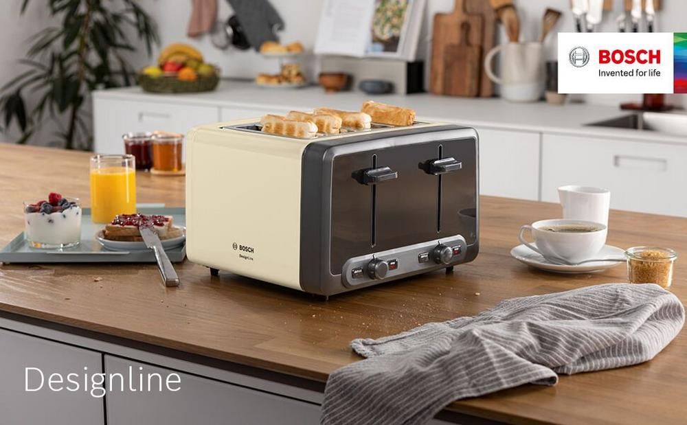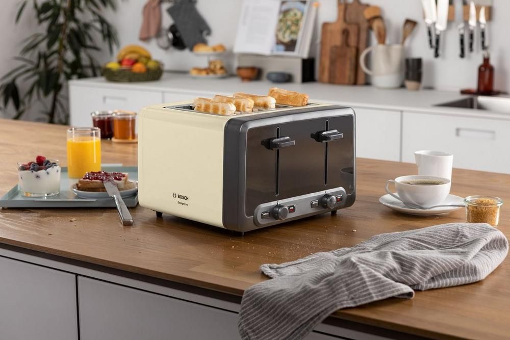 Save time in the morning thanks to this Bosch DesignLine Plus four slot toaster. Measuring just 20 cm x 30 cm x 28.5 cm, the TAT4P447GB will fit easily onto almost any kitchen worktop. Enjoy toast the way you like it, with four-level variable browning – you’ll get the perfect crunch every time.Key features4 toaster slotsDefrost and warm-upEven toasting with automatic bread centeringEach toasting chamber can be independently operated and set to different toasting levelsWhy not add the matching kettle to your kitchen for a seamless, classic look – TWK4P437GB.Easy Like Sunday MorningSeveral helpful features can be found on the TAT4P447GB, for your convenience. Thanks to the removable crumb tray, it’s easy keeping your toaster clean. All you need to do is slide out the tray to remove any crumbs and debris from inside the model.The Bosch TAT4P447GB also includes four functions so you get your toasted goods just the way you like them. These include:ToastReheatBagelBrowning controlWhat’s that burning smell? With the cancel button, you can quickly release the contents of your toaster for immediate removal. No more scraping away at your blackened slice of toast – this handy function will let you take it out whenever you need to.There’s also a reheat setting, to warm your toast back through without burning the bread. Left your toast on the table for too long? Can’t get the butter to spread properly? This model lets you bring it back up to temperature, for hot, buttery toast at any time of day.Store bread for longer in your freezer and thaw it out when you need it with this model’s handy defrost button. What’s more, this model automatically centres the bread for even toasting every time.Coming in a lovely cream colour, the Bosch TAT4P447GB will make breakfast time a breeze. Add one to your basket today.