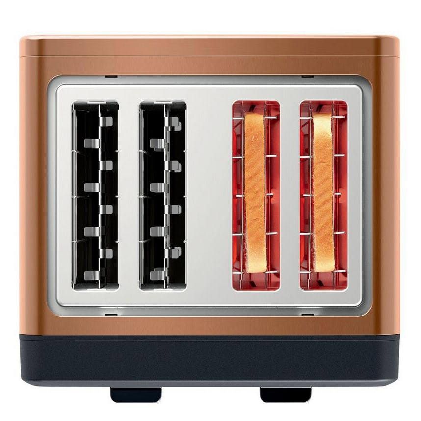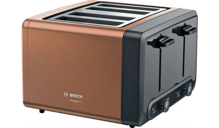 Breakfast wouldn’t be the same without toast. The TAT4P449GB four slice toaster offers even browning and comes with a removable crumb tray – perfect for families who like to keep on top of the cleaning.Make a statement and add the matching kettle to your kitchen for a seamless look – TWK4P439GB.This Bosch toaster keeps breakfast time simple. With just a few buttons and dials to control, you can get your toast just how you like it, every time. Adjust the heating time to suit, with six different browning levels for the perfect slice. And, if you need your breakfast sooner, just use the convenient cancel button.Each toasting chamber can be used independently, giving you more flexibility. Whether you like slices gently heated or brown and crunchy, you can achieve perfect results with ease. As well as a toast function, you’ll find a reheat option too – you’ll never have to eat cold toast again. There’s also a handy defrost feature, so you can toast frozen bread quickly and save yourself valuable time in the mornings.The TAT4P449GB comes in a high gloss, copper finish which will fit into a range of kitchen styles and looks great on your work surface. Plus, the integrated cord storage means you can keep your surfaces neat and tidy when the toaster isn’t in use.Unlike some models, the TAT4P449GB won’t leave the end of your slice untoasted. It uses an automatic system which centres your bread to ensure even heating. What’s more, the high-rise facility means it’s simple to extract contents from the appliance – even the smaller slices of bread are easy to remove. For added safety, Bosch has included an automatic shut-off function which stops the toaster if bread does get stuck. The crumb trays are removable too for added cleaning convenience.Looking for a new toaster? The TAT4P449GB is the perfect choice for every household. Add one to your basket today.