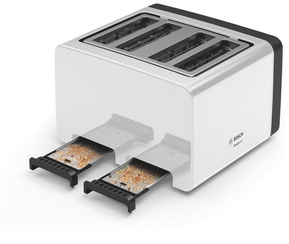 Key featuresDifferent toasting levels from independent slotsDefrosts your toast and makes it crunchyAutomatic shut-off stops the toaster when the bread gets stuckRemovable crumb tray for easy cleaningToast your favourite snacks to perfection with this Bosch four slice toaster. Offering easy-use features, multiple functions, and a range of browning settings, the TAT5P441GB will take your morning routine to the next level.This model comes in a classic white, but if you’re looking for a different colour, then why not check out the TAT5P445GB in anthracite?Toaster FunctionsWhether you like your bread lightly toasted or with a darker finish, the Bosch TAT5P441GB can cater to a variety of preferences. You’ll find six different toasting levels, and four independent slots, to help you prepare multiple breakfasts at the same time – from wholemeal or sourdough loaf slices, to fruity teacakes and fluffy pancakes.This toaster also comes with pre-set functions to grill your items in the right way:CancelDefrostReheatToastThe Defrost setting gently thaws your food, warms it through, and gives it that final satisfying crunch. Or, if you need to eat in a hurry, just press the Cancel button for the appliance to stop toasting instantly.User-Friendly FeaturesBosch has designed this four slice toaster with ease of use in mind. For households where safety comes first, the Automatic Shut off will keep minds at rest – this feature stops the toaster without prompt if a doughy muffin or spongy crumpet gets stuck in one of the slots. As a result, you won’t need to worry about snacks burning, and you can go about your chores stress-free.Family life can be hectic, and the post-breakfast clean-up needs to be quick and simple. Thanks to the removable tray on the TAT5P441GB, crumbs are collected aside from your worktops, and can be disposed of in the bin with ease.Make breakfast your way with this Bosch four slice toaster – it’s the ideal combination of style, functionality, and safety.