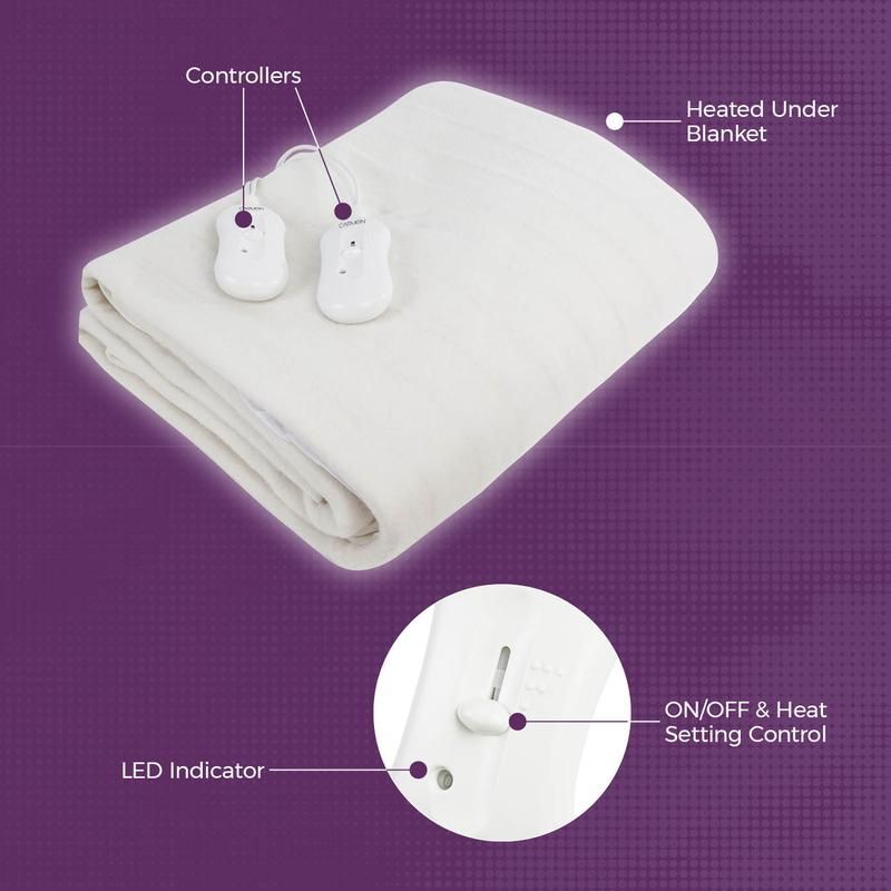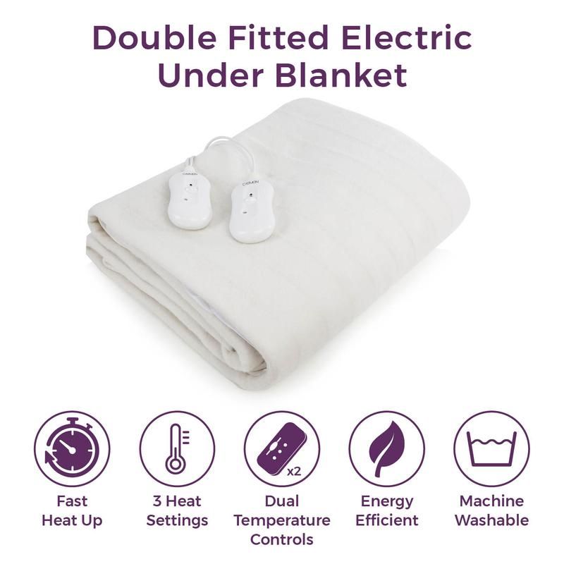 Enjoy extra warmth and cosiness all night long with the Carmen Double Fitted Electric Under Blanket made from 450gsm polyester soft to touch fabric. With a powerful 65W x 2 output and choice of 3 different heat settings, the blanket heats up to your perfect temperature in no time for a comfortable night's sleep. Fits neatly edge to edge across your double mattress for complete body warmth. With 2x detachable controllers, you can adjust the temperature from either side of the bed. The blanket is efficiently designed to allow consistent warmth as you sleep, costing just 40p per night to run. For a quick and easy clean, simply detach the temperature controller and pop the blanket into the washing machine. The blanket automatically switches off to avoid overheating and provides added safety, so you can operate it safely during the day and night.Product Specification65W x 2 for quick and efficient heat upMachine washable at 40degrees makes caring for your blanket easy3 heat settings so you can find your perfect temperatureDual temperature control with 2 x detachable controllersLED indicator is visible in the dark for adjusting the temp at nightExtra warmth and cosiness with 450gsm polyester soft to touch fabricFully fitted design with deep elasticated skirt for a secure fit1.5m long power cable - Overheat protection for added safetyItem dimensions: H193cm x W137cm x D1cm + 40cm fitted skirtItem Height: 193.00cm.Item Length: 1.00cm.Item Width: 137.00cm.Packaging Height: 37.00cm.Packaging Length: 13.00cm.Packaging Width: 50.00cm.Carton Height: 40.00cm.Carton Length: 52.00cm.Carton Width: 68.00cm.Carton Quantity: 5Pallet Quantity: 40Standard Warranty: 1Standard Warranty Extension: 2