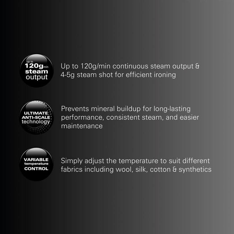 Powerful Performance: With a super powerful performance, it boasts up to 120g/min continuous steam output and a 4-5g steam shot for impeccable results. The 3 bars of steam effortlessly eliminate fabric wrinkles by adding moisture, ensuring smoother ironing.