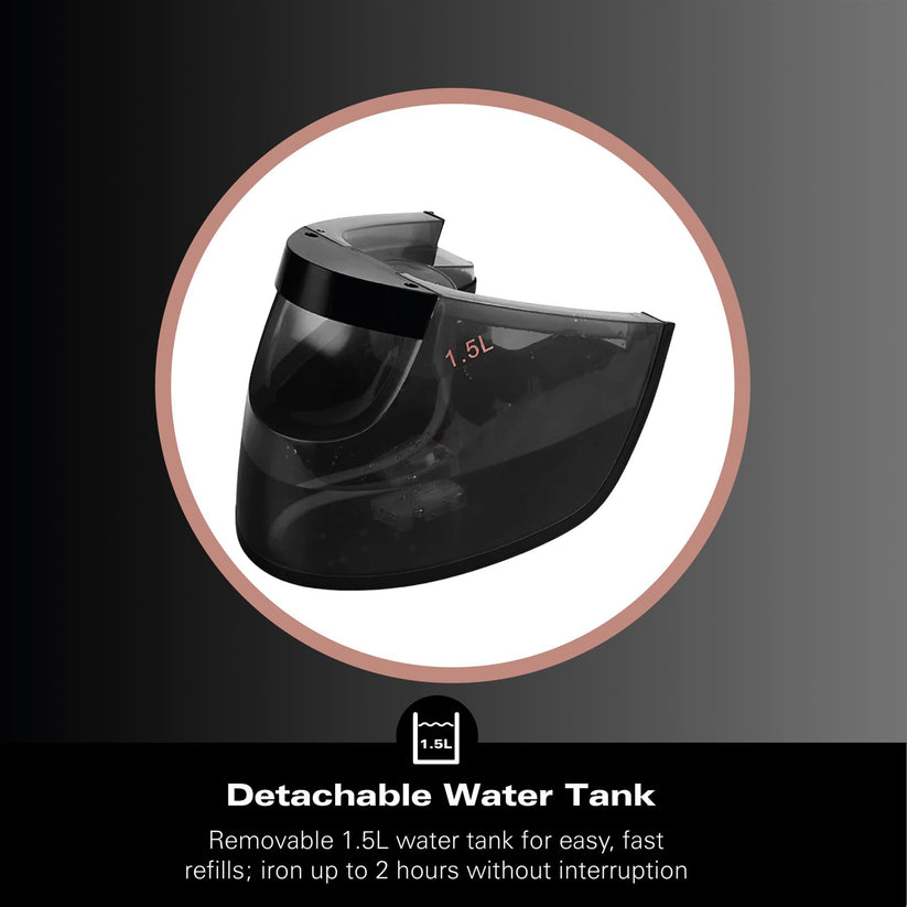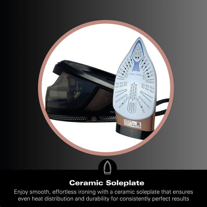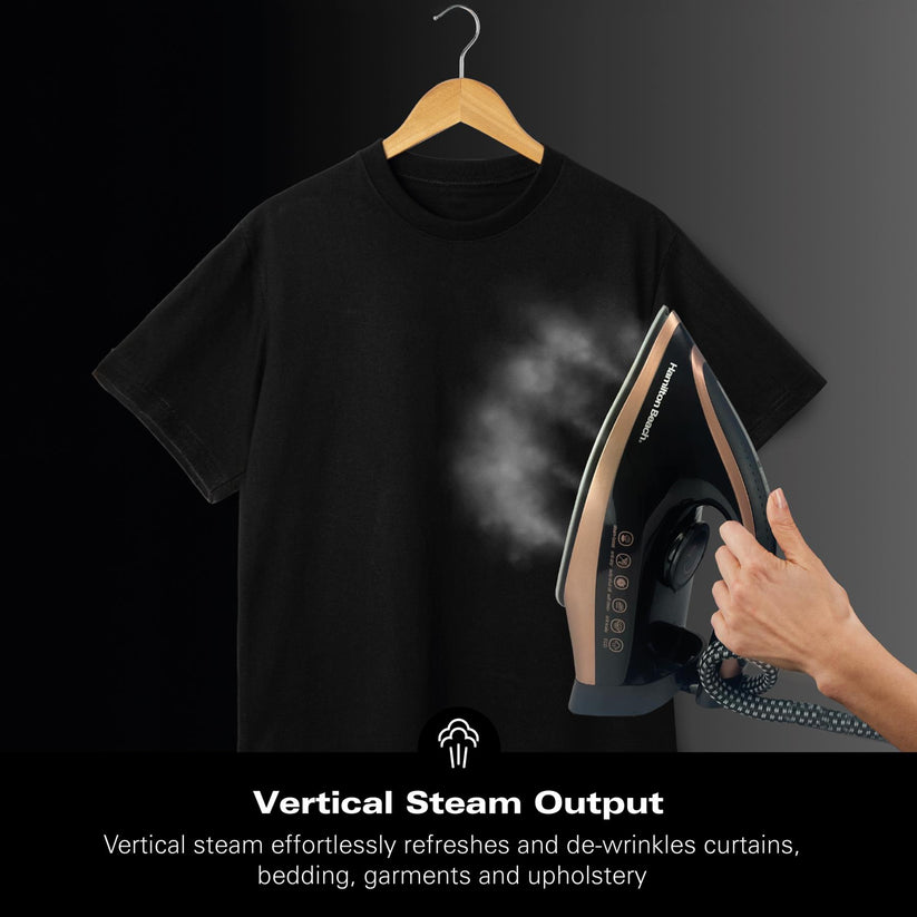 The ProCare Steam Generator Iron is perfect for wrinkle-free results. With super powerful performance, it delivers up to 120g/min continuous steam and a 4-5g steam shot for powerful ironing. The 3 bars of steam effortlessly eliminate wrinkles by adding moisture, while the non-stick ceramic soleplate glides smoothly. Benefit from vertical steam for various fabrics, anti-scale technology, and variable temperature control. Safety is ensured with automatic shut-off after 10 minutes of non-use. Elevate your ironing with the Hamilton Beach ProCare—a blend of powerful functionality and convenience for flawless results.