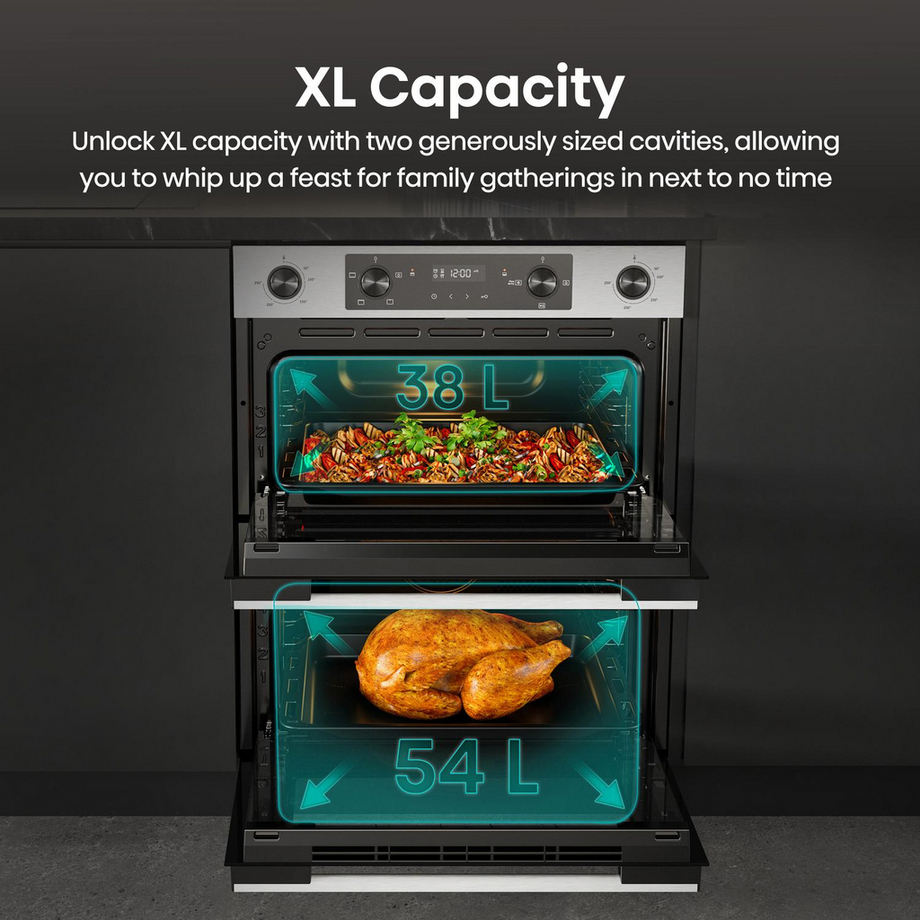 With a substantial 92-litre total capacity, split between a 38-litre upper cavity and a 54-litre lower cavity, you can prepare multiple dishes at once with ease. The main electric fan oven distributes heat evenly across every shelf, eliminating hot spots and ensuring perfectly cooked meals whether you're baking, roasting, or batch cooking for the week ahead.