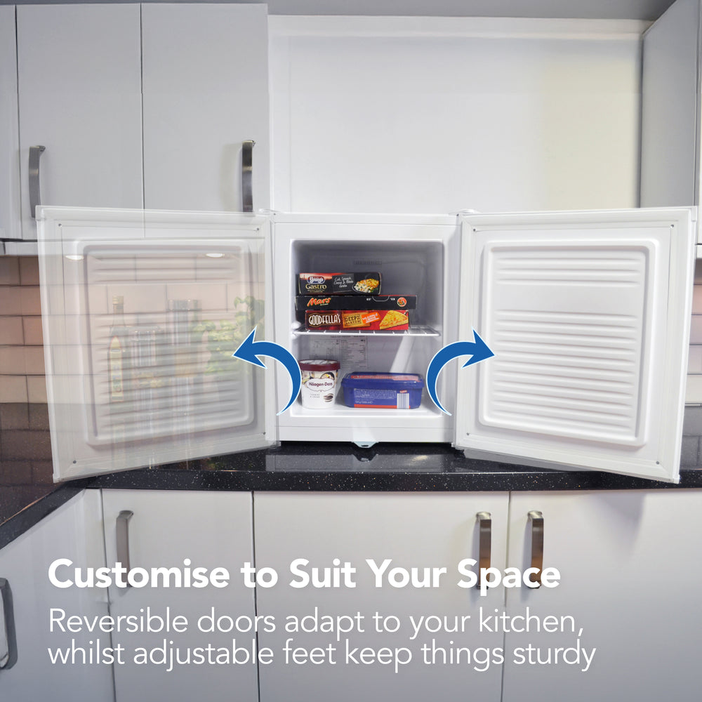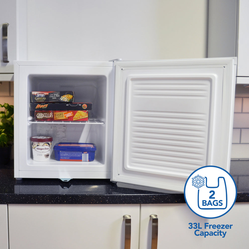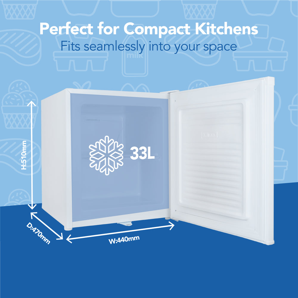 Designed with convenience in mind, this 33-litre table top freezer offers reliable performance in a sleek white finish that complements any kitchen, utility room, office, or annexe. Its compact footprint (H 51cm x W 44cm x D 47cm) makes it ideal for apartments, student accommodation, holiday homes, or as additional freezer storage when you need extra capacity.