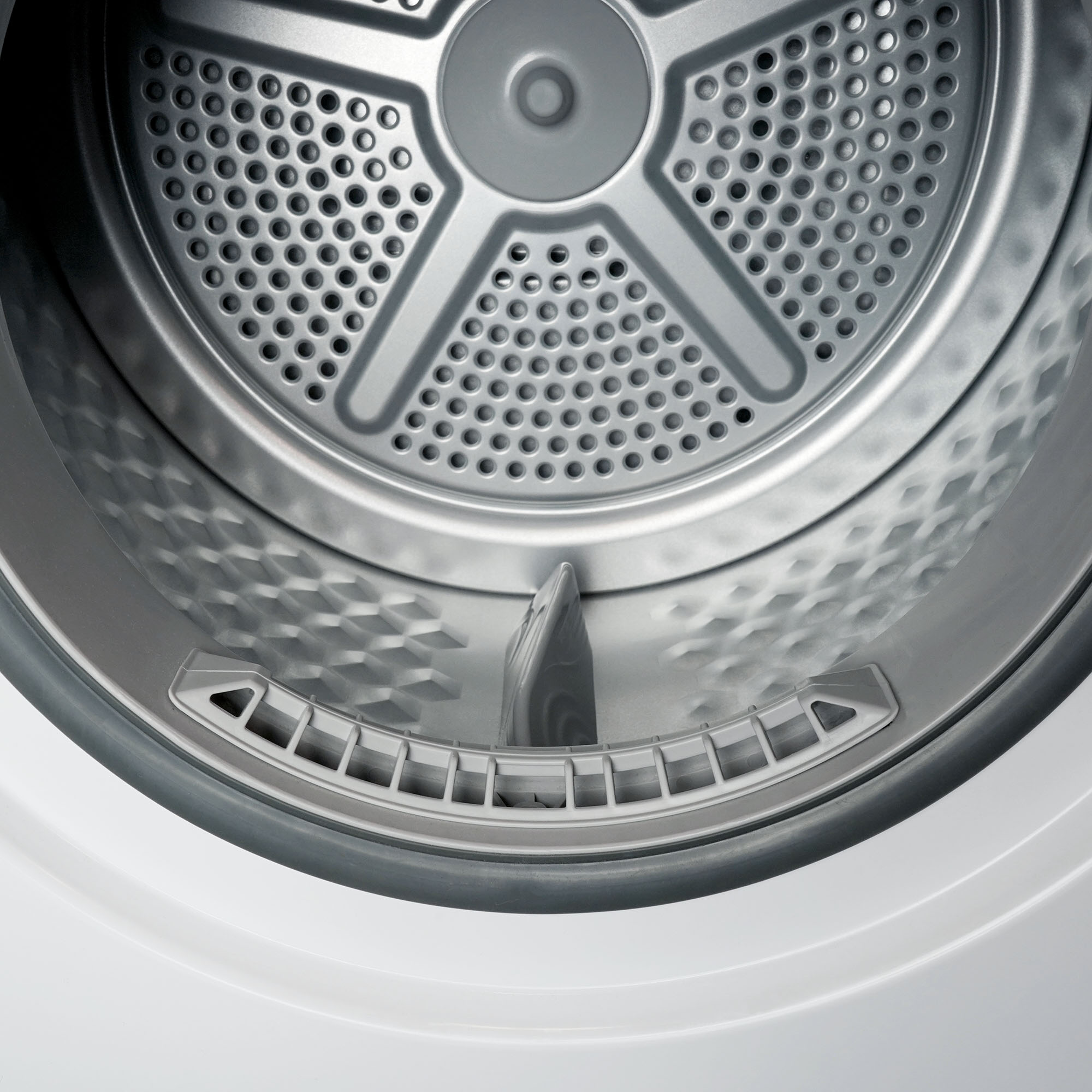 This tumble dryer features intuitive electronic touch controls for easy operation, combined with its stylish white finish, making it a modern and efficient addition to your home.