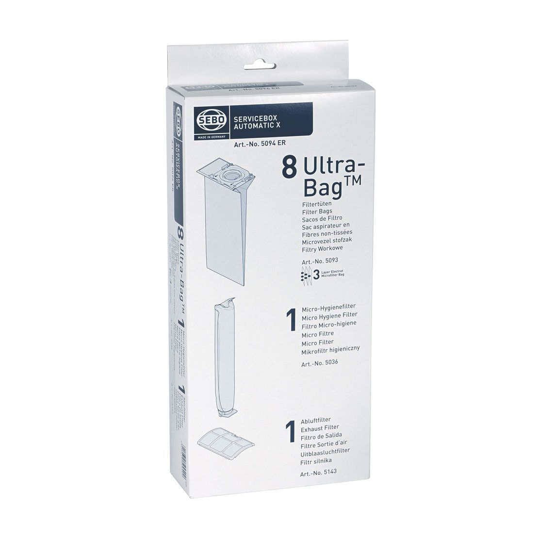 A cost-effective way to buy bags and filters. The X Series Upright Service Box contains 8 ultra-bags, a microfilter and an exhaust filter.Suitable for X1, X2, X3, X1.1, X4, X4 EXTRA, X4 PET, X4 EXCEL, X5 EXTRA, XP2, XP3, X1.1 ECO, X4 EXTRA ECO, X4 PET ECO, X5 EXTRA ECO upright vacuum cleaners.Regularly changing the filters prolongs the life of the machine and ensures optimum performance. The X Series Service Box contains 8 x Ultra-Bags, 1 x 5036ER Microfilter and 1 x 5143 Exhaust Filter.This service box is not compatible with AUTOMATIC X7 + X8 vacuum cleaners.