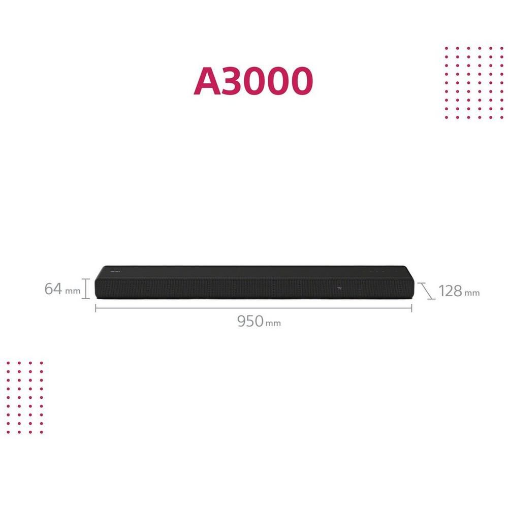 This new soundbar from Sony really is stunning, surround yourself with absolute realism with Sony’s HTA3000_CEK soundbar. With 3.1 channels and four built in speakers, movies and music are brought to life right in your living room.Key featuresSupports 360 Spatial Sound Mapping with optional rear speakersS-Force PRO Front Surround and Vertical Surround Engine for multi-dimensional soundBuilt-in X-Balanced dual subwoofer for powerful bassSound Field Optimization for easy set upSurround SoundImmerse yourself in box office favourites with S-Force PRO Front Surround technology. This virtual surround sound function reproduces the sound field, with audio coming at you from both sides. Using front speakers only, the HTA3000_CEK lets you enjoy rich, cinematic surround sound from all around you.Thanks to Sony’s virtual surround technology, the soundbar can position sound in vertical space – so you can experience 3D audio without the need for in-ceiling or up-firing speakers. As well as Dolby Atmos and DTS:X, Vertical Surround Engine lends a more realistic, multi-dimensional sound to other formats too. Plus, the HT-A3000 has 3.1 channels: three front speakers, including a centre speaker for clear dialogue, plus a built-in X-Balanced dual subwoofer for deep bass.And, this model supports 360 Spatial Sound Mapping technology which adapts to your environment. Using Sony’s rear speakers (sold separately), this revolutionary technology recreates the effect of multiple speakers around your space, so you get a new sensation of sound. There’s no need to precisely place the additional speakers, as the built in microphone measures the position of each speaker, optimising the sound for your room. Hear every breath, step, and whisper with complete clarity, it will feel like you’re right there.Sony DetailsThe Sony HTA3000_CEK features a range of inputs to connect a range of devices, including one HDMI and one USB port. Enjoy all your favourite content with the best audio in the house.In addition, with Bluetooth connectivity and Wi-Fi built in, you can stream music from your smartphone, tablet, or laptop. Use the Spotify Connect app to play music directly through the soundbar and AirPlay2 to share music and more from your Apple device – all with just a tap. And, you can stream content using Chromecast. Just tap the Cast button to get going.Compatible with Google Assistant and Alexa-enabled devices, you can play, change the volume and much more using your voice. Just add the HTA3000_CEK to your speaker using the Google Home app to get started.Designed to fit around your set-up, this stunning soundbar comes in a sleek black finish to suit any home décor. The included kit means you can mount it to the wall for complete unobstructed sound.Enjoy sound just how it should be with the HTA3000_CEK from Sony - it’s the ultimate home entertainment accessory. Order yours today or pop in store for a demo, 783 Chesterfield Road, Sheffield S8 0SP. Brand Name SonySound System Dolby Atmos®Weight (Approximate) 4.6kgSmart Connect Spotify Connect™Apple Airplay 2Number of built in speakers 4Wall mountable YesManufacturer Sony CorporationUSB 1Height 6.4cmNumber of Channels 3.1Colour BlackHDMI 1Width 95cmWi-Fi YesDepth 12.8cmProduct Type SoundbarCompatibility AlexaGoogle AssistantFeatures Supports 360 Spatial Sound Mapping with optional rear speakersS-Force PRO Front Surround and Vertical Surround Engine for multi-dimensional soundBuilt-in X-Balanced dual subwoofer for powerful bassSound Field Optimization for easy set upBluetooth YesShipping Height 19.0cmShipping Width 101.5cmShipping Depth 18.8cmAdditional Information Stream all your music with wireless connectivityauto standby