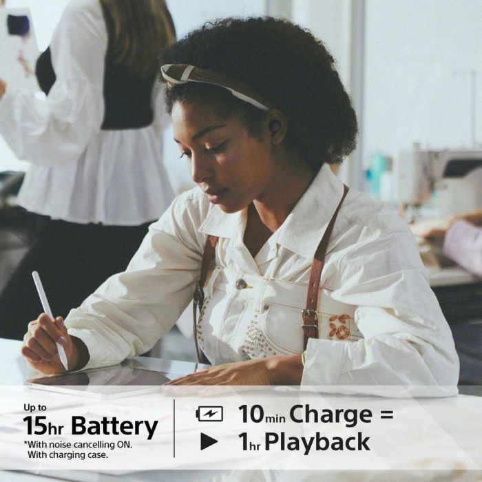Take your favourite audio with you everywhere with these wireless in-ear Bluetooth headphones from Sony. Hear more of what you love and less background noise thanks to Digital Noise Cancelling technology. Turn off your surroundings and enjoy an immersive music experience. With Adaptive Sound Control, the WFC700NB senses where you are and then adjusts ambient sound settings to suit your location. What’s more, these black headphones take just three hours to charge and offer up to 15 hours of battery life in noise-cancelling mode. Key featuresDigital Noise Cancelling technologyAdaptive Sound Control15 hours battery lifeAdditional Information Easy hands-free calling and voice assistant commands with microphoneFeatures Digital Noise Cancelling technologyAdaptive Sound Control15 hours battery lifeProduct Type HeadphonesDimensions + WeightDepth 1.5000 cmHeight 2 cmShipping Depth 7.4000 cmShipping Height 5.5000 cmShipping Weight 0.1600 kgShipping Width 10 cmWeight 0.4600 kgWidth 2.5000 cmBrown Goods + SDA FeaturesMicrophone YesNoise Cancelling YesDesign ElementsColour BlackColour Group BlackEarpiece Type In-EarConnectivityBluetooth YesConnectivity Technology BluetoothWireless Operating Distance 10 mProduct TypeProduct Category Group CEAdditional InformationWarranty/Guarantee 1 Year WarrantyPower SourceCharging Time 3 Hours