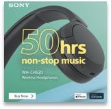 Enjoy rich and detailed sound wherever you go with these truly wireless Bluetooth headphones from Sony. Perfect for on the move, you’ll get high-quality sound whatever you choose to listen to. With up to 50 hours of battery life, you can listen to your favourite music all day without worry. And, a 3-minute quick charge can give you 1.5 hours of listening time. Connect the WHCH520B with two devices at once with Multipoint Connection and the stylish black design add comfort to your listening.Key Features Two devices multipoint connection (can connect to two Bluetooth devices at the same time) 360 Reality audio Lighter weight - less than 200g Improved comfort fit designAdditional Information Easy hands-free calling and voice assistant commands with microphoneFeatures Noise Cancelling with Dual Noise Sensor50 hours battery lifeComfortable, lightweight designProduct Type Over-earDimensions + WeightDepth 4 cmHeight 22.8000 cmShipping Depth 4.4000 cmShipping Height 22.8000 cmShipping Weight 0.3200 kgShipping Width 17.2000 cmWeight 0.1470 kgWidth 15 cmBrown Goods + SDA FeaturesMicrophone YesNoise Cancelling YesDesign ElementsColour BlackColour Group BlackEarpiece Type Over-EarConnectivityBluetooth YesConnectivity Technology BluetoothWireless Operating Distance 10 mWireless Technology BluetoothProduct TypeProduct Category Group Brown GoodsAdditional InformationWarranty/Guarantee 1 Year WarrantyPower SourceCharging Time 3 hours