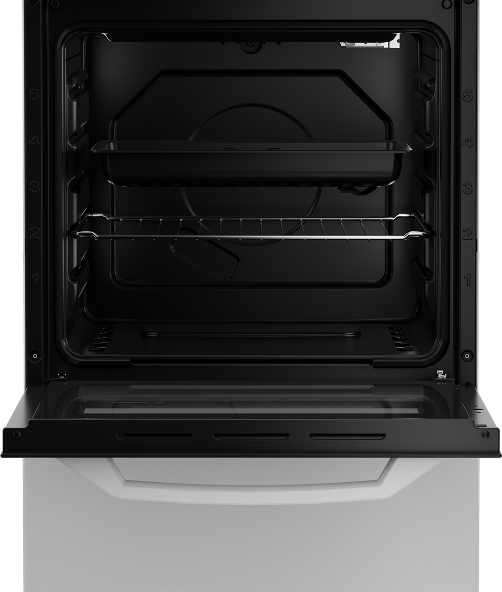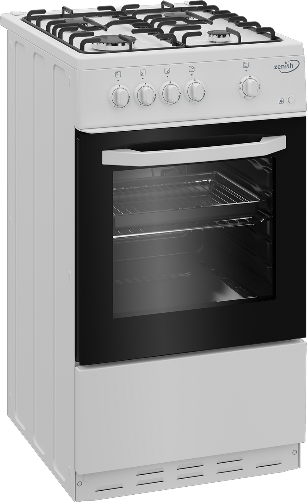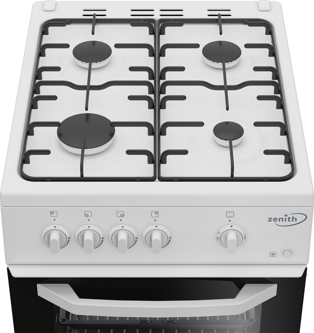 Bake, boil and grill all your favourite foods with the ZE501W from Zenith. Featuring a traditional gas oven, four-burner gas hob and a fixed integral grill, you can cook meals for all the family with ease. You won’t be able to buy this freestanding cooker at any other retailer, as it’s exclusive to Euronics and Agent stores.Zone-Style Gas CookingRoast joints for Sunday gatherings or cook three-course meals inside the main compartment of the ZE501W – as a traditional gas oven, it’s great for zone-style cooking. There’s a usable capacity of 55 litres and five optional shelf slots, giving you ultimate flexibility for your culinary adventures.If you’re a fan of healthy eating or need to crisp up a dish, you’ll also find a fixed integral grill, while the interior bulb light helps you monitor your foods’ progress. Controlling the oven is simple with its non-retractable dials and mechanical display, and the included accessories – a grill pan set and wire shelf – will help you get started straightaway.This Zenith cooker also has a gas hob, where you can boil potatoes, flambé desserts or flash fry steaks across four burners. With power outputs ranging from 1 kW to 2.9 kW, you’re sure to find a flame to suit whatever you’re cooking, and the push button ignition makes it easy to start up the heat.Features and DesignSafety should come first when it comes to cooking. Thanks to this Zenith model’s FFD (Flame Failure Device), you can put your mind at ease, as the gas flow automatically stops if a flame goes out. There’s also an optional LPG conversion kit available, which will upgrade your cooker’s fuel supply from natural gas to higher pressure LPG.To reduce time spent cleaning, the Zenith ZE501W has enamel linings in the oven and enamel pan supports on the hob – which are both quick and simple to wipe down. If you need to soak off food marks from the double-glazed oven door, then it’s removeable for you to give a scrub in the sink.As a freestanding model in a fresh white, this gas cooker gives you installation flexibility, and is sure to fit into your kitchen perfectly.