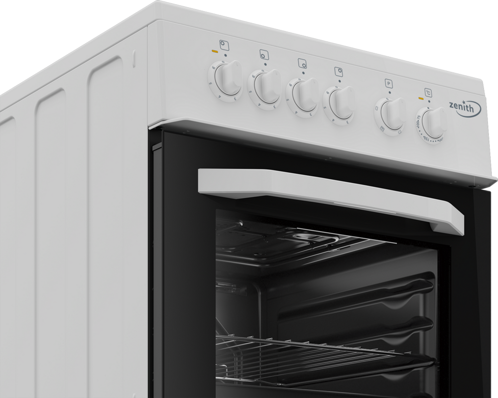 Cleaning is made simple with the Zenith ZE503W. Its enamel oven linings are easy to wipe down, and the oven door is removable for a more thorough clean when needed.